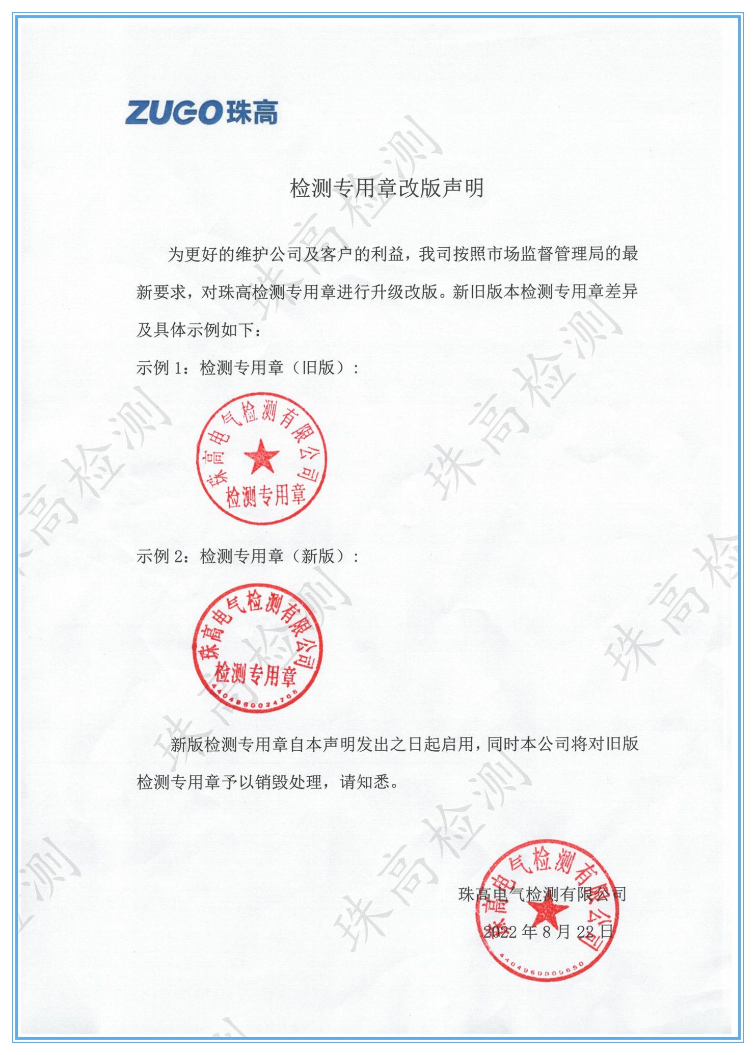 檢測專用章改版聲明